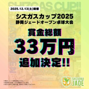 この度、静岡ガスグループ様特別協賛のもと、『シズガスカップ2025 静岡ジェードオープン卓球大会』を開催いたします。