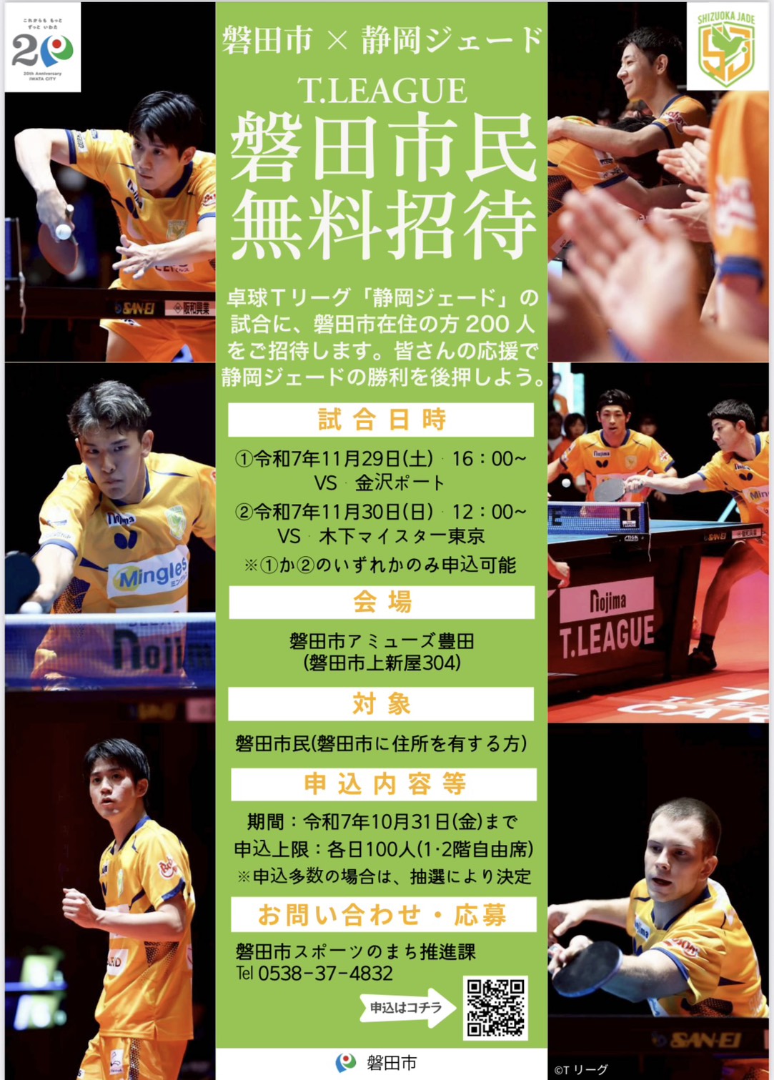 11月29日、30日アミューズ豊田にて開催される静岡ジェードのホーム戦のチケットを磐田市在住の方を対象に、各日100名様にプレゼントします。